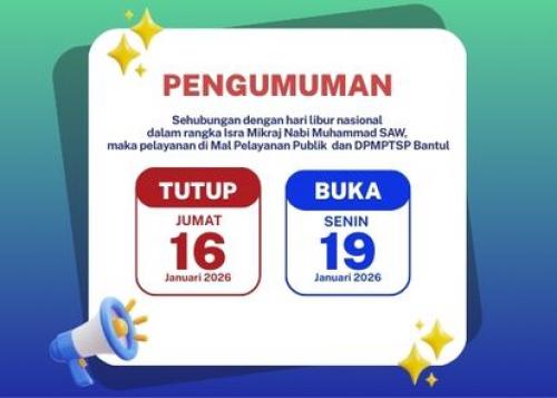 Sehubungan dengan Hari Libur Nasional dalam rangka Isra Mikraj Nabi Muhammad SAW.*,  maka  pelayanan di Mal Pelayanan Publik dan DPMPTSP Bantul (layanan, konsultasi, pengaduan via tatap muka, WA, telepon, media sosial, dan online): TUTUP Jumat 16 Januari 2026 BUKA kembali Senin 19 Januari 2026 Informasi seputar layanan perizinan berusaha dan non berusaha bisa anda ...