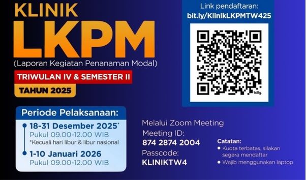 Untuk memudahkan penyampaian Kegiatan Penanaman Modal (LKPM) periode Triwulan IV dan Semester II Tahun 2025. Kementerian Investasi dan Hilirisasi/BKPM menyediakan layanan konsultasi virtual Klinik LKPM bagi pelaku usaha.